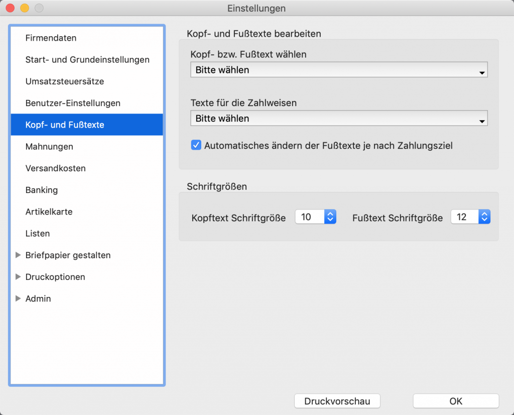 Für Rechnungen können Sie unter Zusätzlicher Gesetzestext Rechnung notwendige gesetzliche Angaben machen. Diese werden unter dem Fußtext gedruckt.